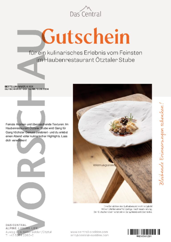 A pine-panelled parlour and a culinary experience of the highest order: rooted in tradition and refined with international flair. In our award-winning restaurant Ötztaler Stube, this is not a contradiction – it’s the essence of fine dining. This experience voucher gives the gift of exceptional indulgence. It includes a 5-course menu (excl. drinks).