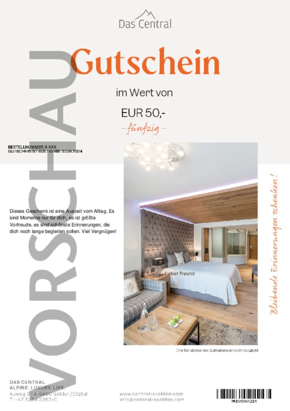 With this value voucher of the 5-star hotel DAS CENTRAL - ALPINE . LUXURY . LIFE in Sölden I would like to give a miraculous time to you. Take some time out and pamper yourself!